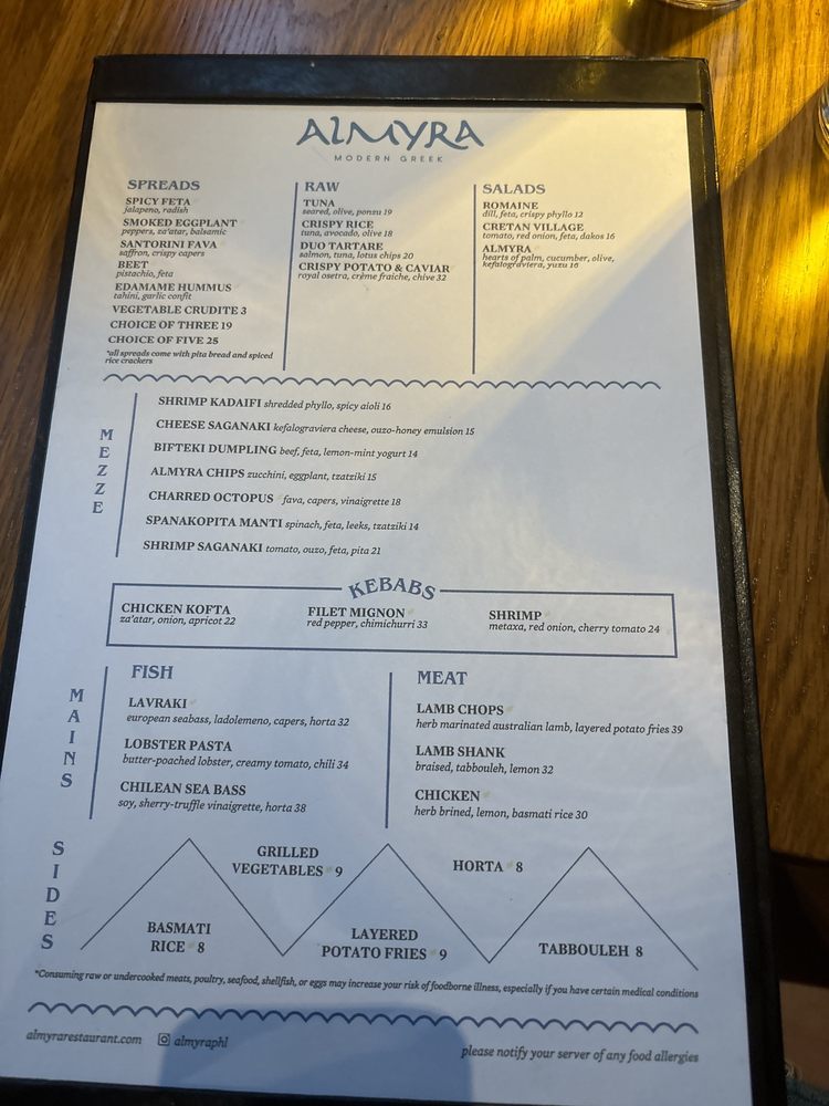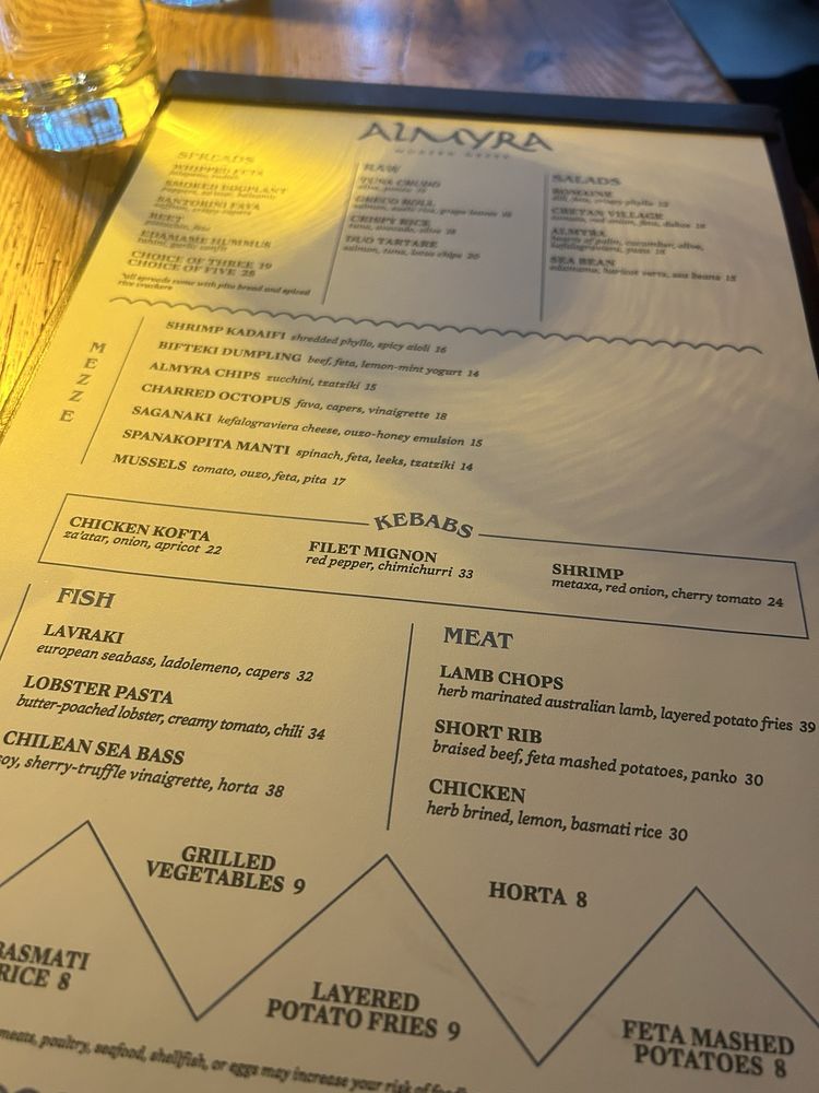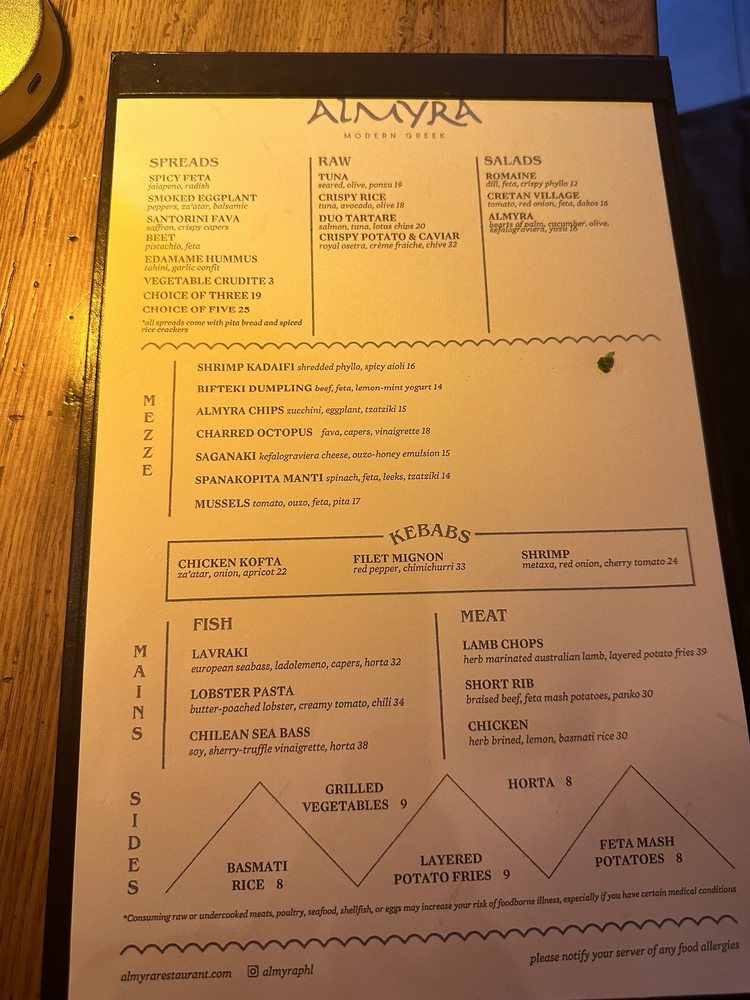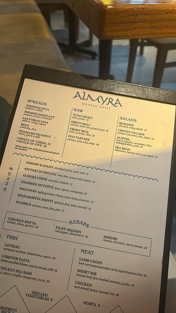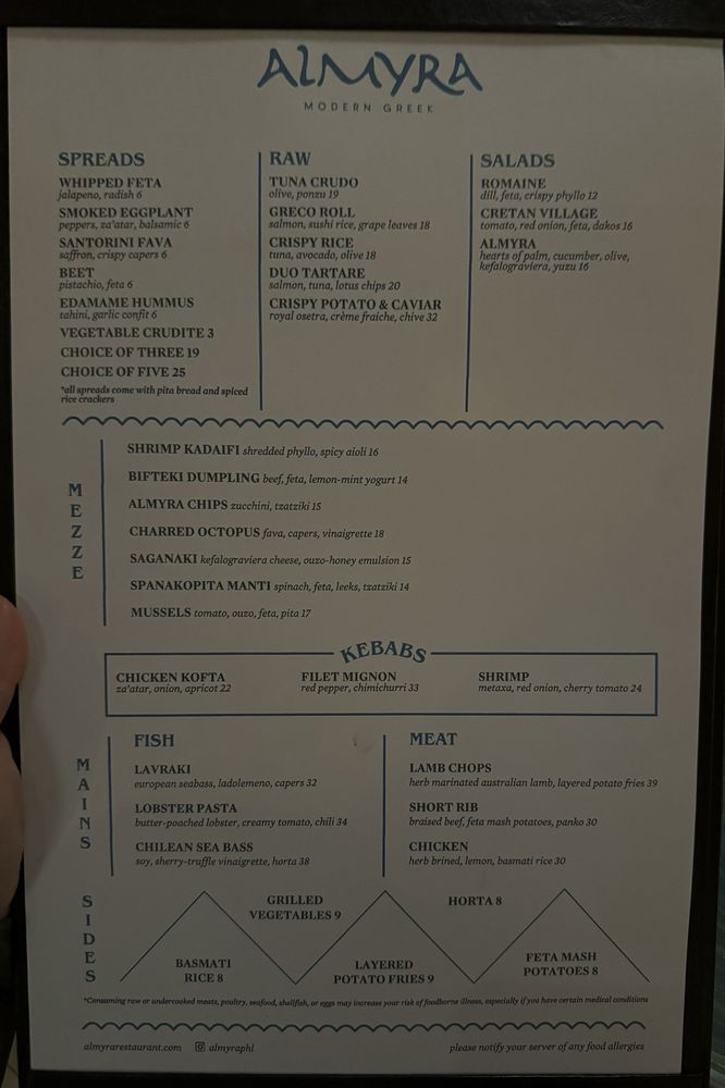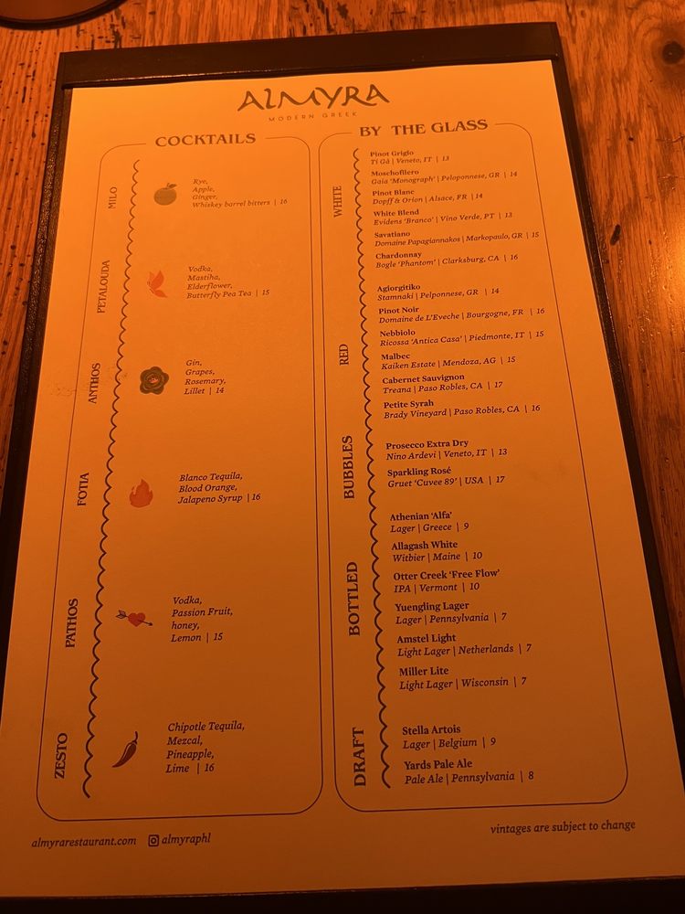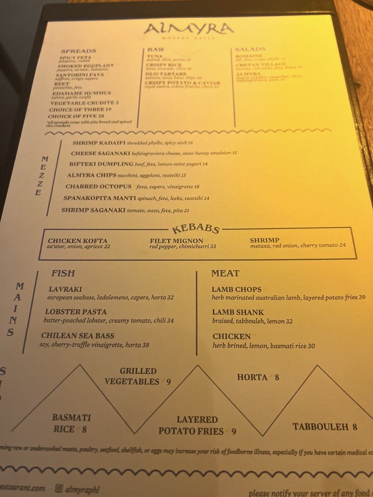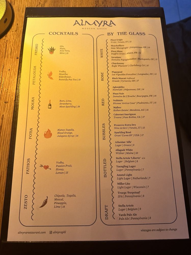 Almyra, a Greek restaurant located in Philadelphia, offers a classy and upscale dining experience with limited vegetarian options. Customers rave about the delicious dishes, such as the cheese saganaki, octopus appetizer, and lamb entree. The ambiance of the restaurant gives off Greek island vibes, with beautiful decor and a full bar offering happy hour specials. While some find Almyra to be on the pricier side, the overall dining experience and knowledgeable staff make it worth the visit. Standout menu items include the lamb chops, chicken kebab, and trio of dips. The cocktails are also highly recommended, adding to the vibrant vibe of the place. Almyra is the perfect spot for a special occasion or a classy dinner out.